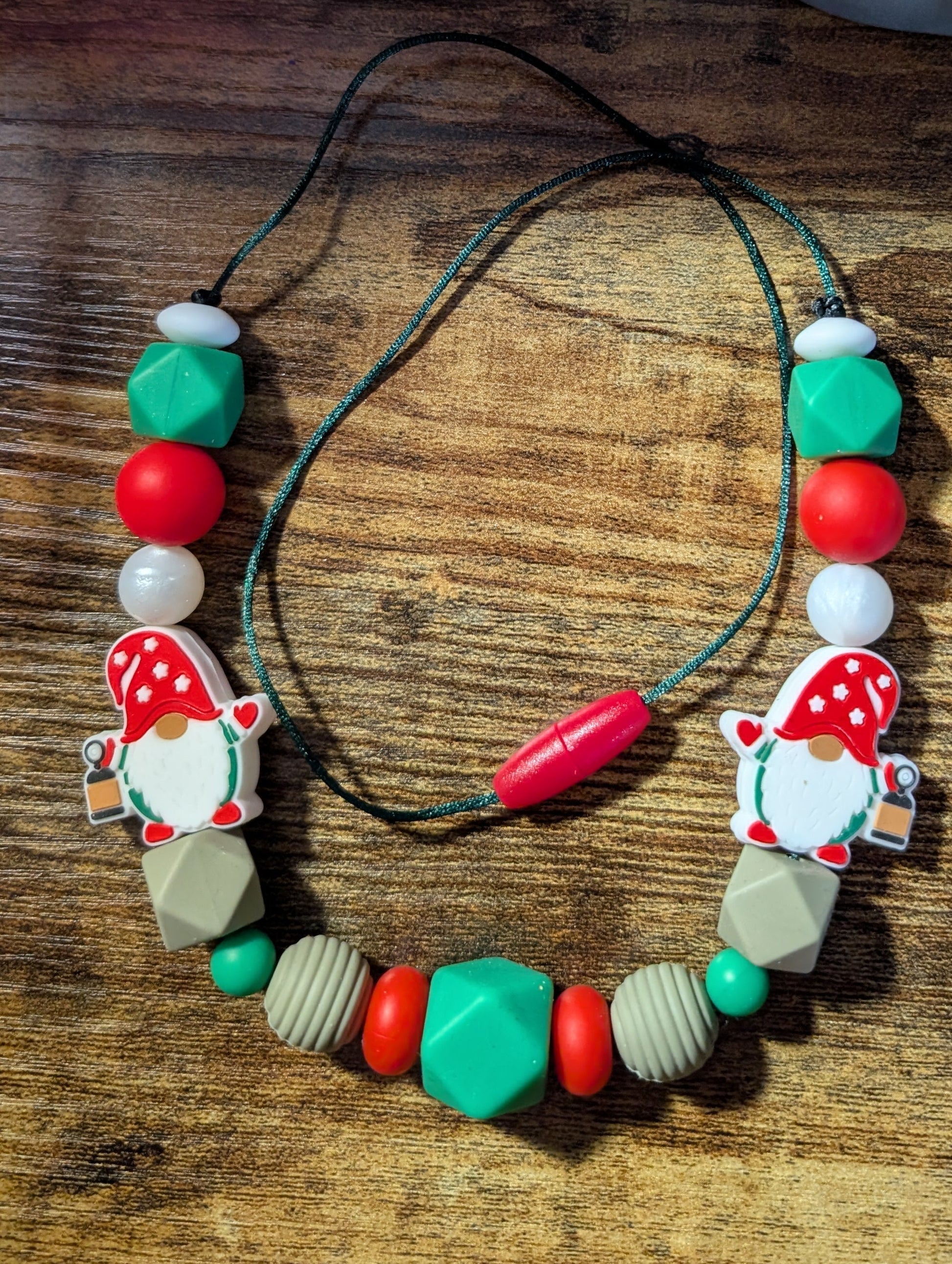 This sensory necklace features premium food-grade silicone beads strung on a delicate dark green silk cord, finished with a secure red breakaway clasp. Designed for tactile stimulation and comfort, it combines safe materials with refined aesthetics for everyday wear.