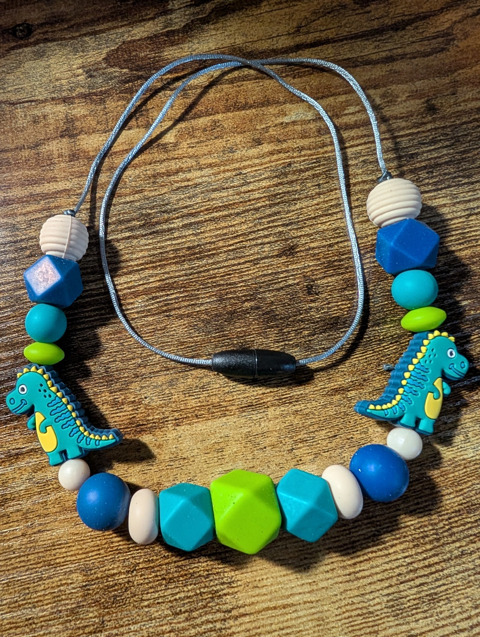 This sensory necklace features premium food-grade silicone beads strung on a delicate silver silk cord, finished with a secure black breakaway clasp. Designed for tactile stimulation and comfort, it combines safe materials with refined aesthetics for everyday wear.