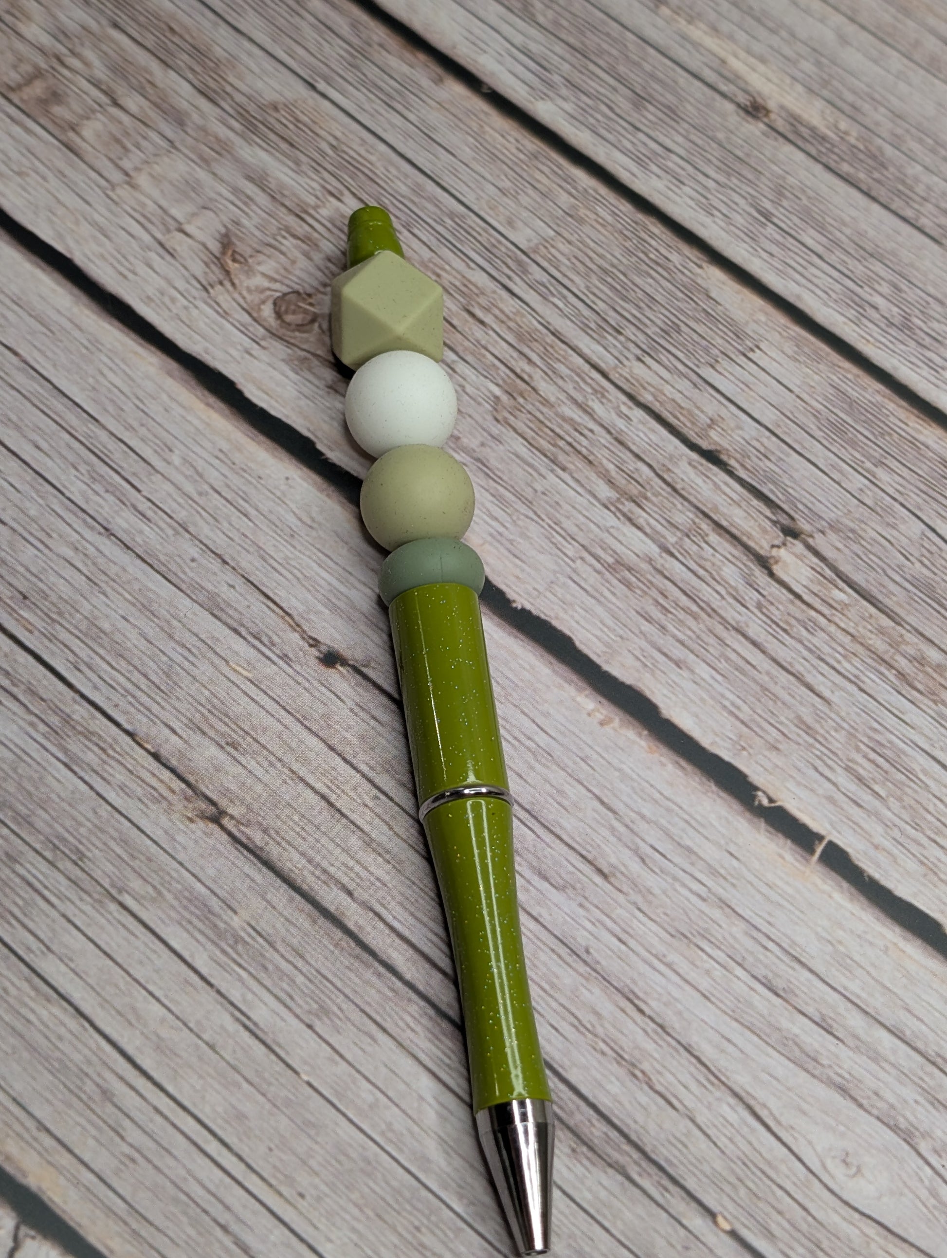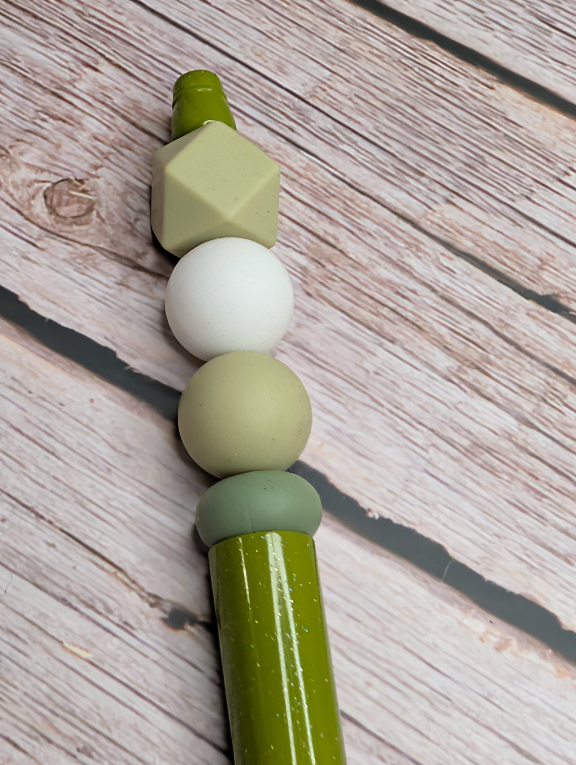 This 5.5-inch beaded pen features a green sparkling body crafted from food-grade silicone. Equipped with black ink, it doubles as a tactile fidget tool, combining various shades of green and white beads for a unique sensory experience.