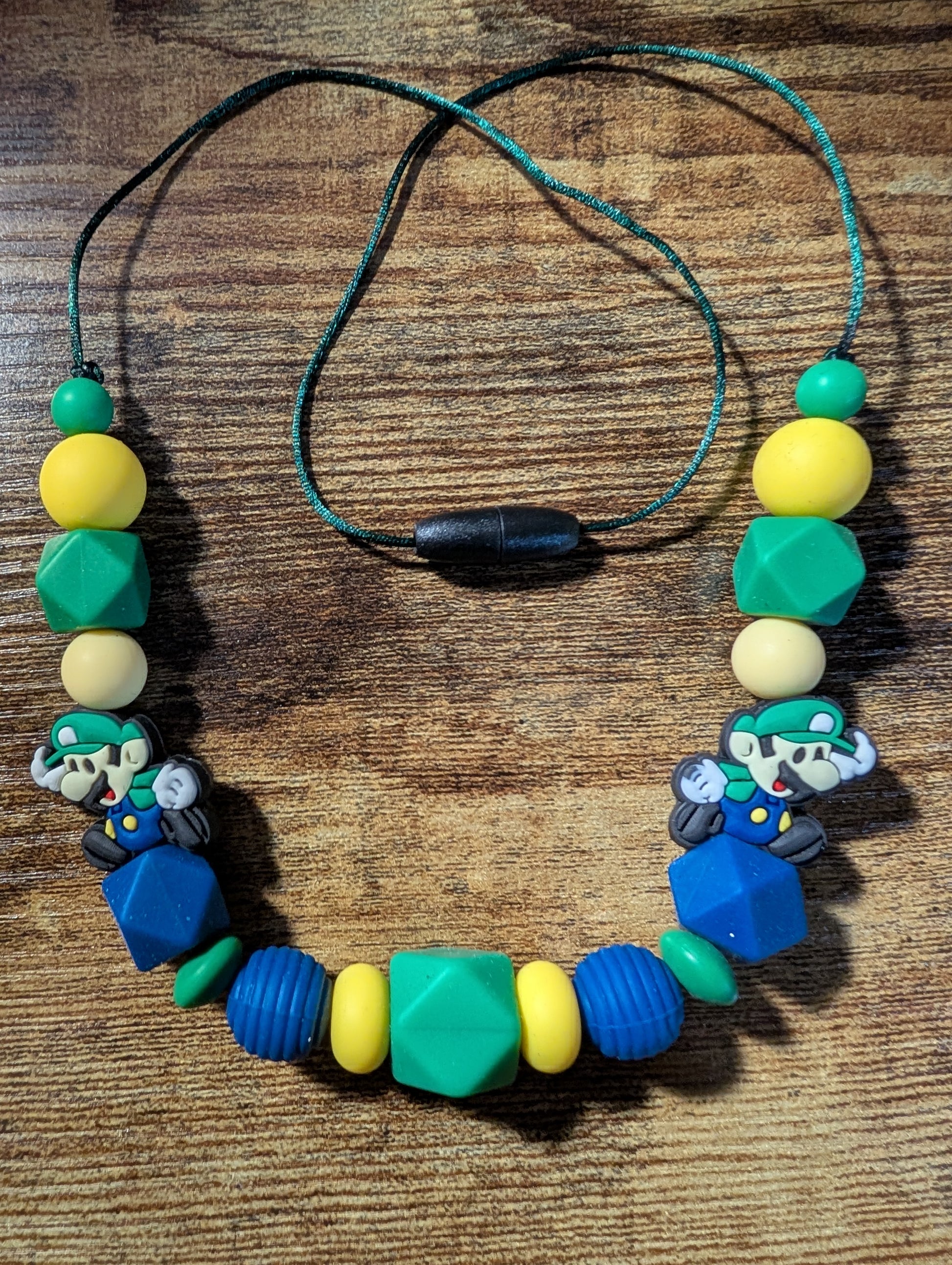 This sensory necklace features premium food-grade silicone beads strung on a delicate dark green silk cord, finished with a secure black breakaway clasp. Designed for tactile stimulation and comfort, it combines safe materials with refined aesthetics for everyday wear.