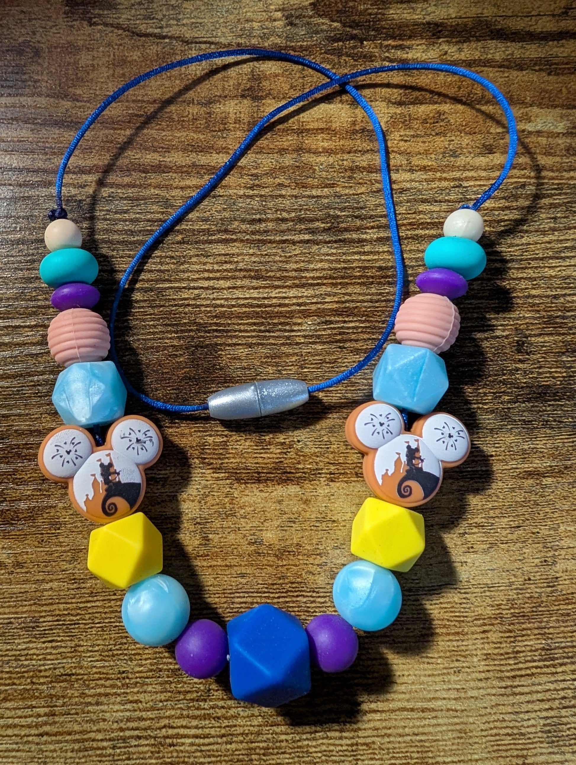 This sensory necklace features premium food-grade silicone beads strung on a delicate blue silk cord, finished with a secure silver breakaway clasp. Designed for tactile stimulation and comfort, it combines safe materials with refined aesthetics for everyday wear.