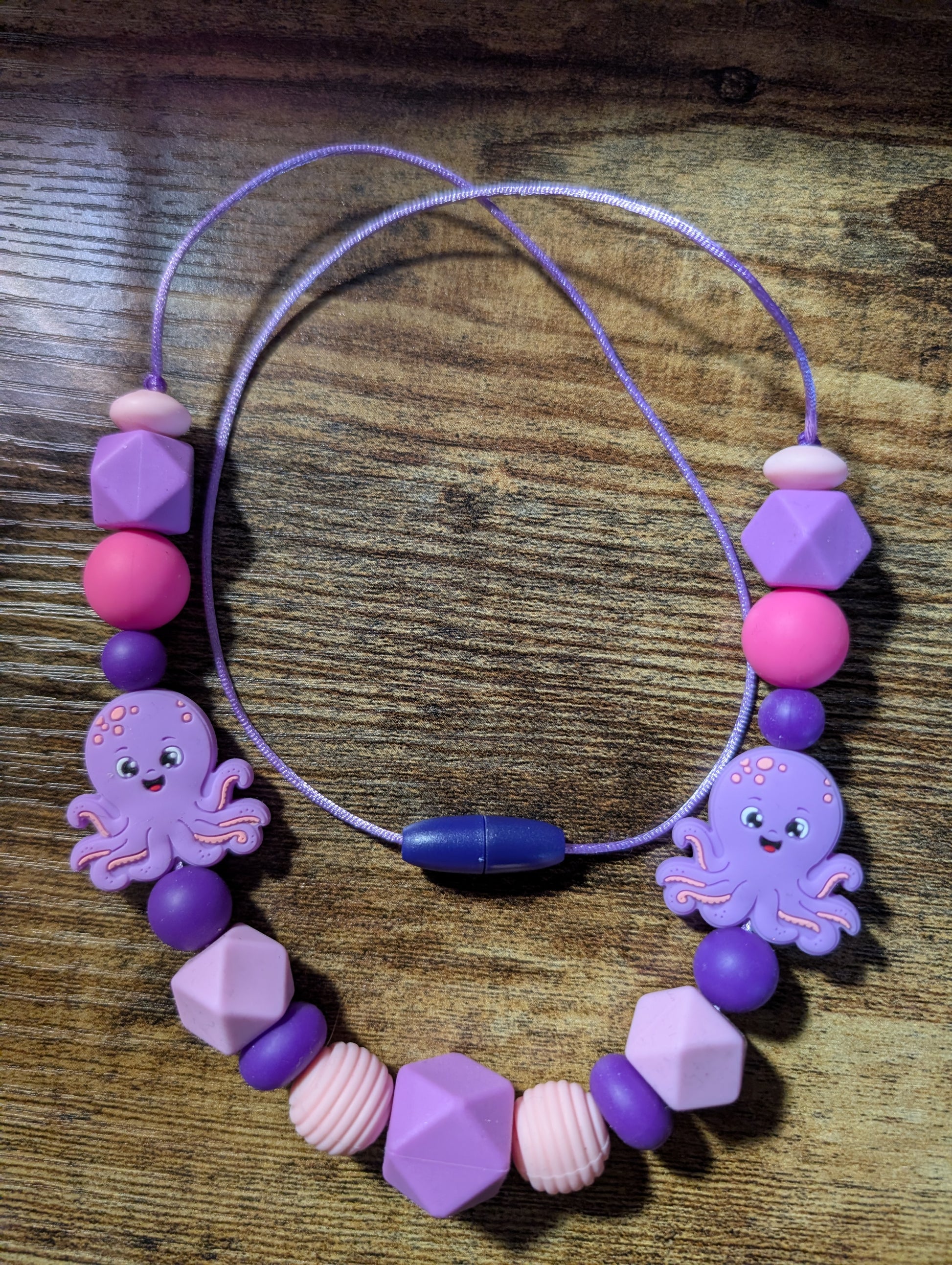 This sensory necklace features premium food-grade silicone beads strung on a delicate lavender silk cord, finished with a secure purple breakaway clasp. Designed for tactile stimulation and comfort, it combines safe materials with refined aesthetics for everyday wear.