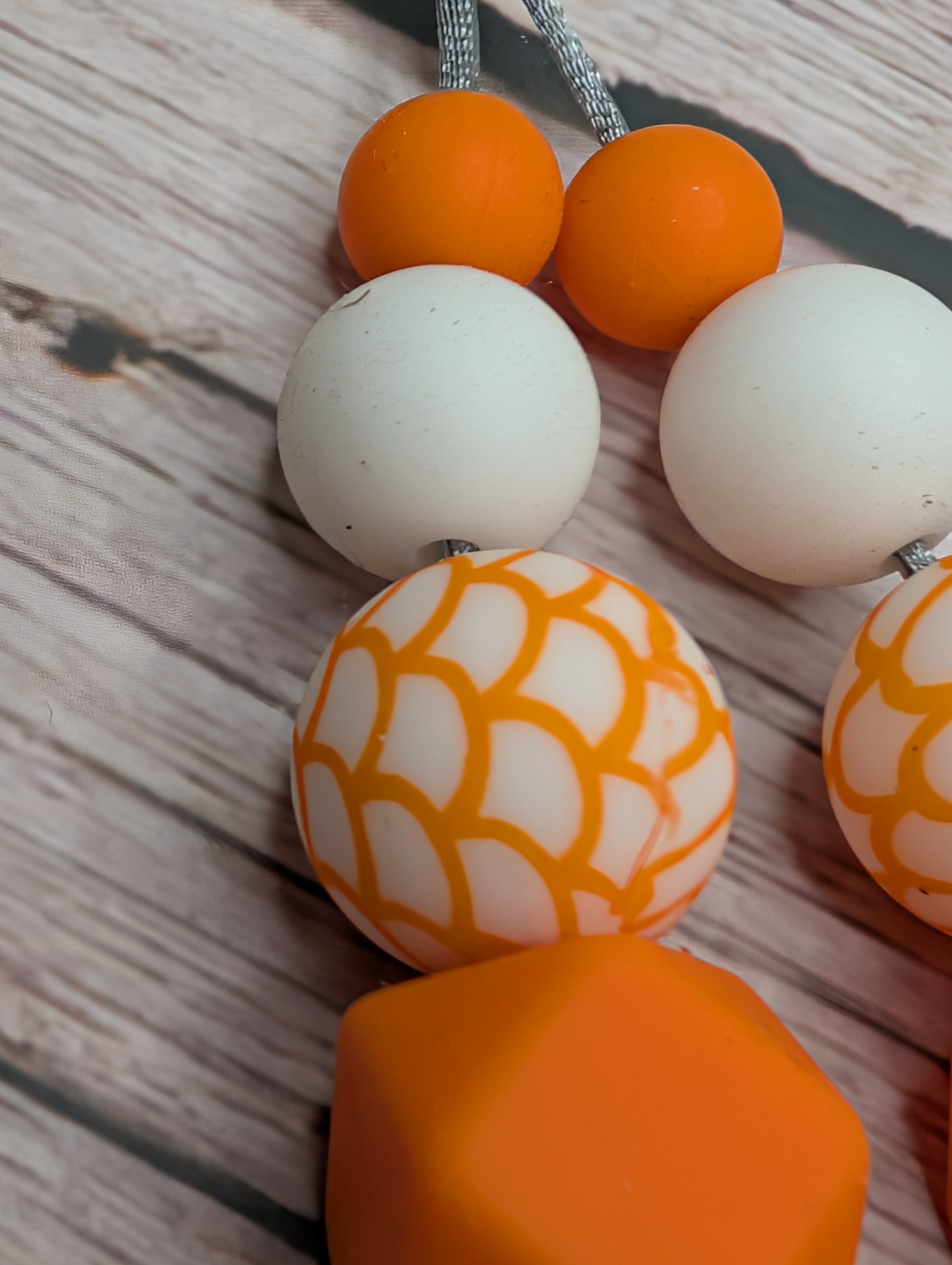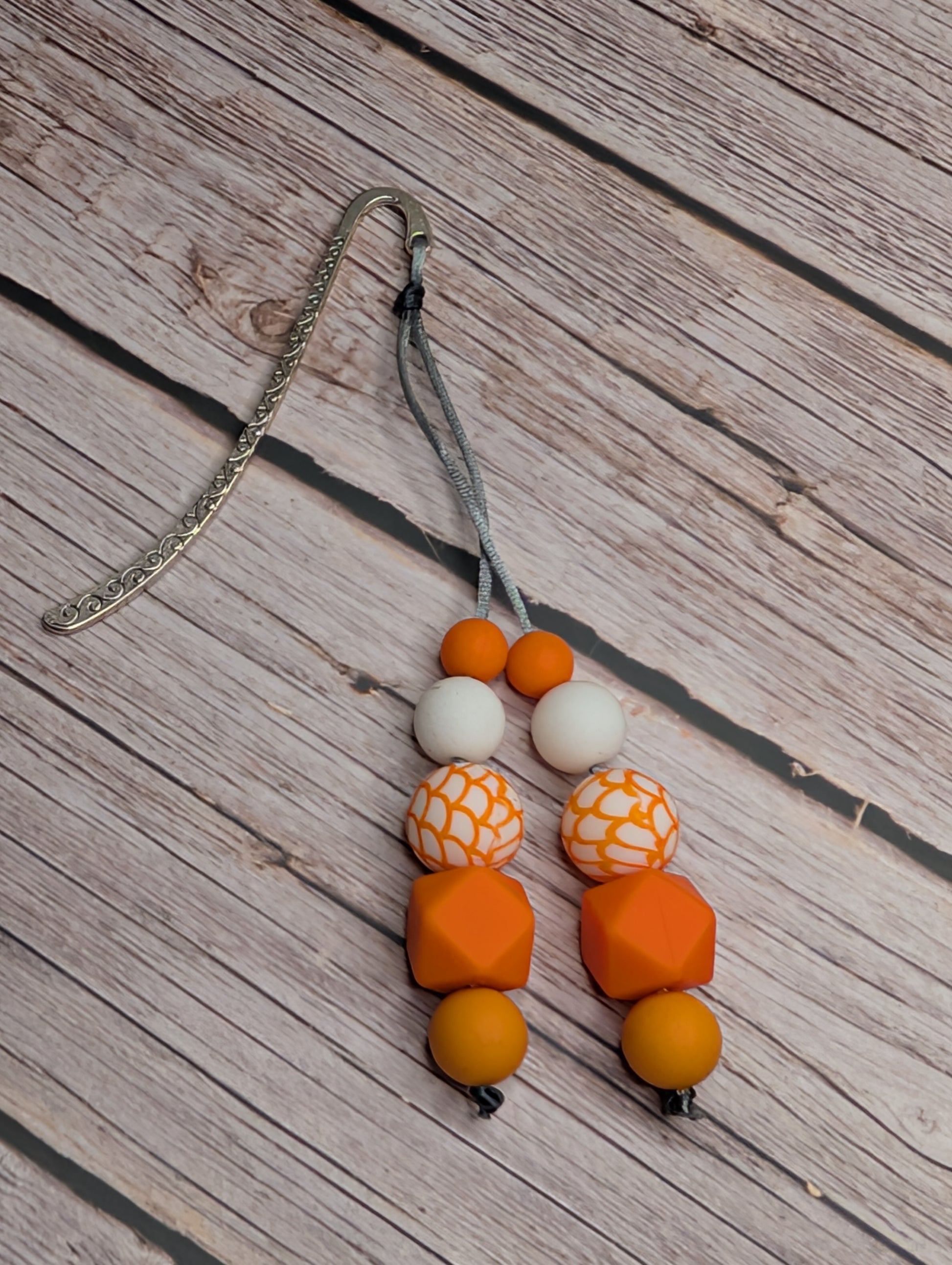This bookmark features food-grade silicone beads strung on satin cord, with a metal hook designed to rest inside the book. It offers a tactile fidgeting experience while you read, with beads that extend approximately 5 inches along the spine.