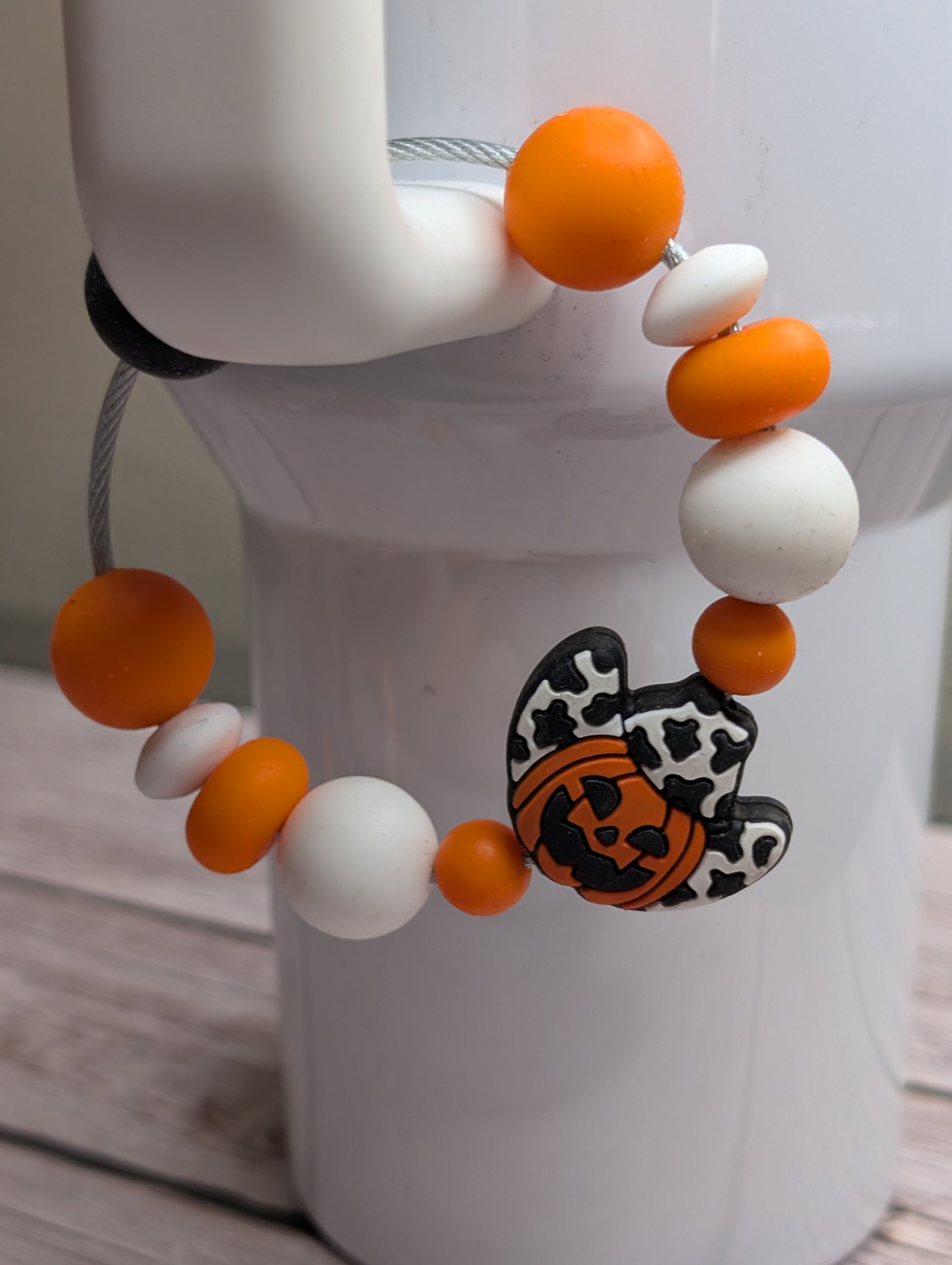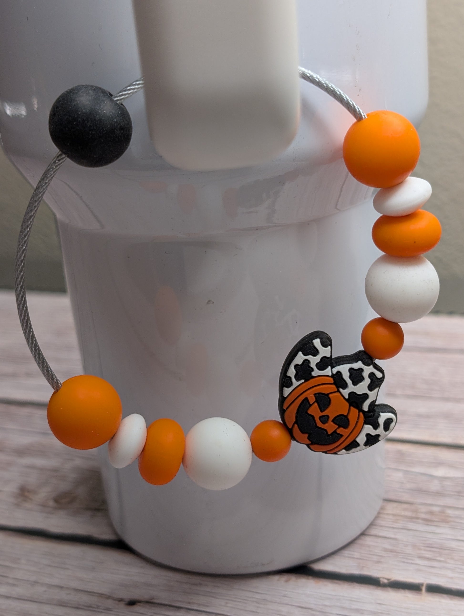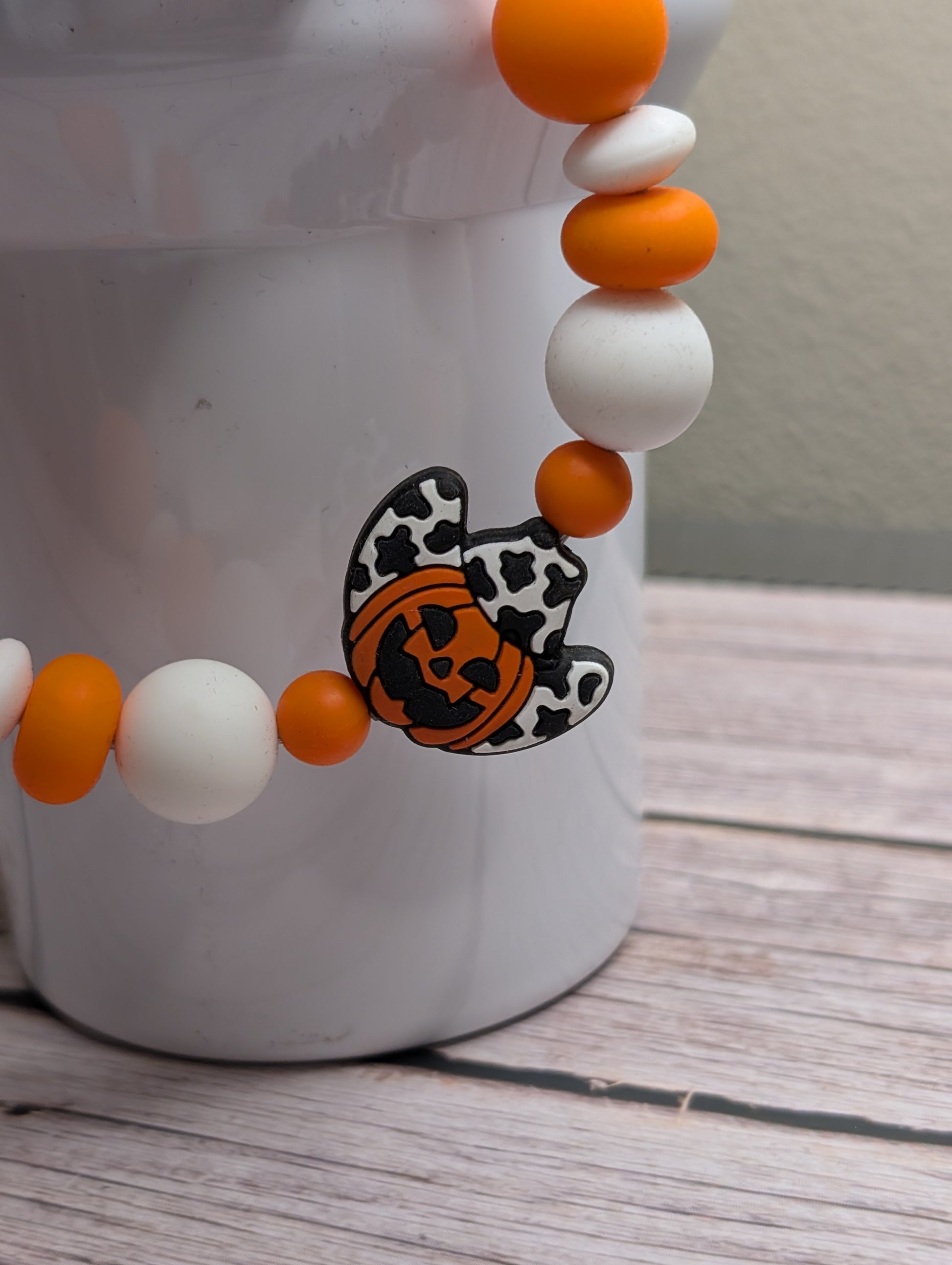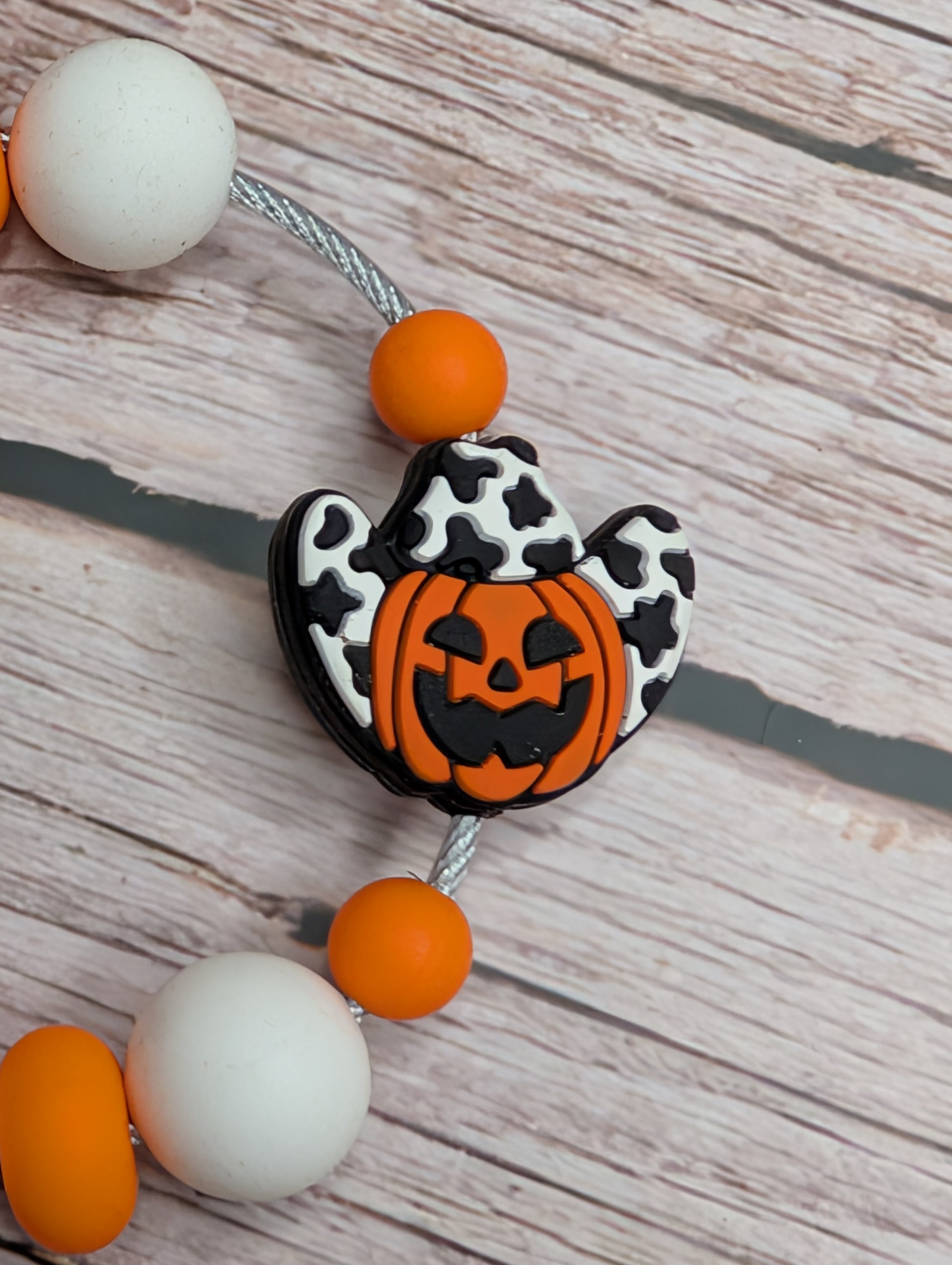 This charm showcases food-grade silicone beads and depicts a pumpkin adorned with a cowboy hat. Made for handles on drink cups. It is available in two different sizes.