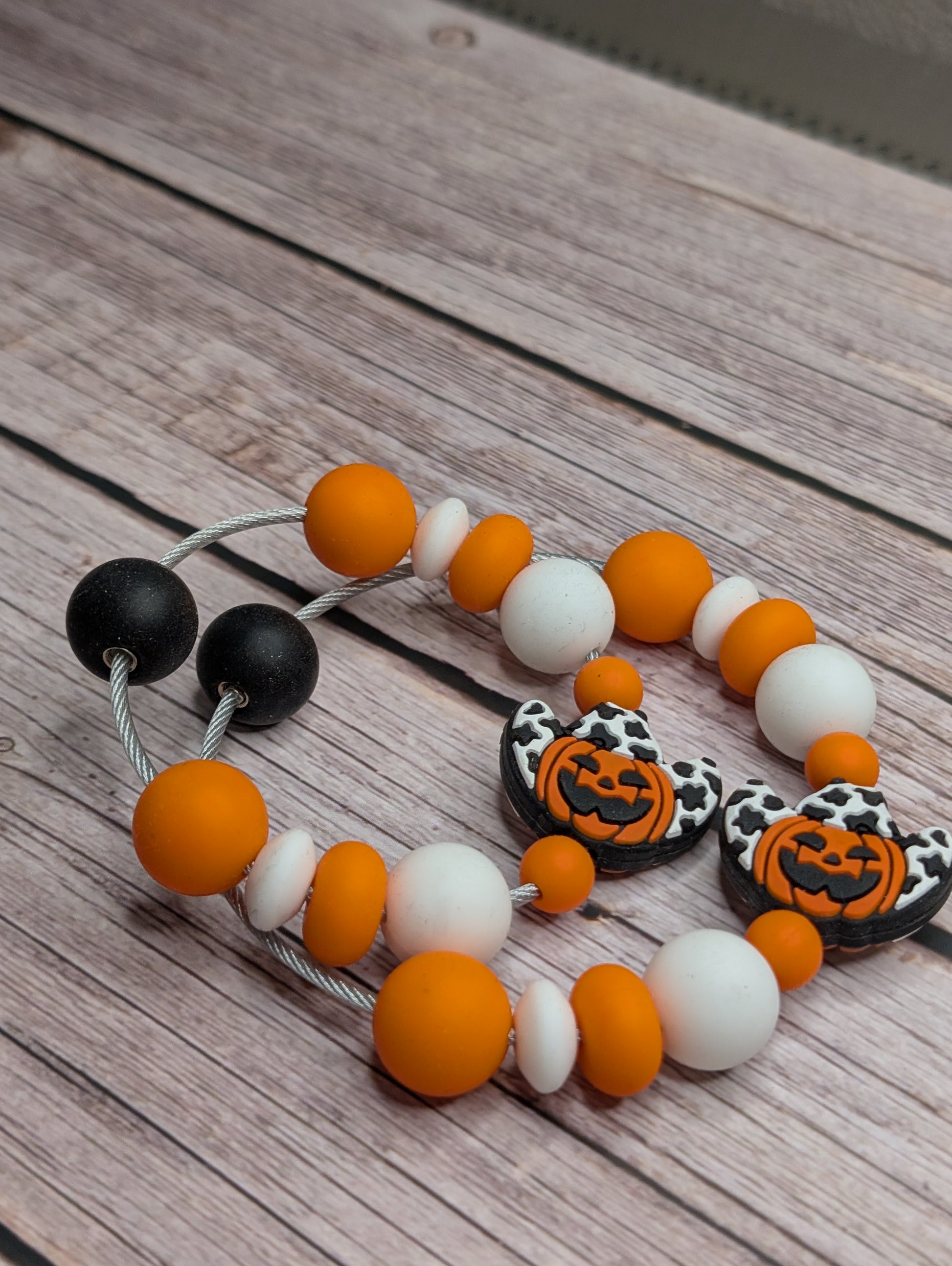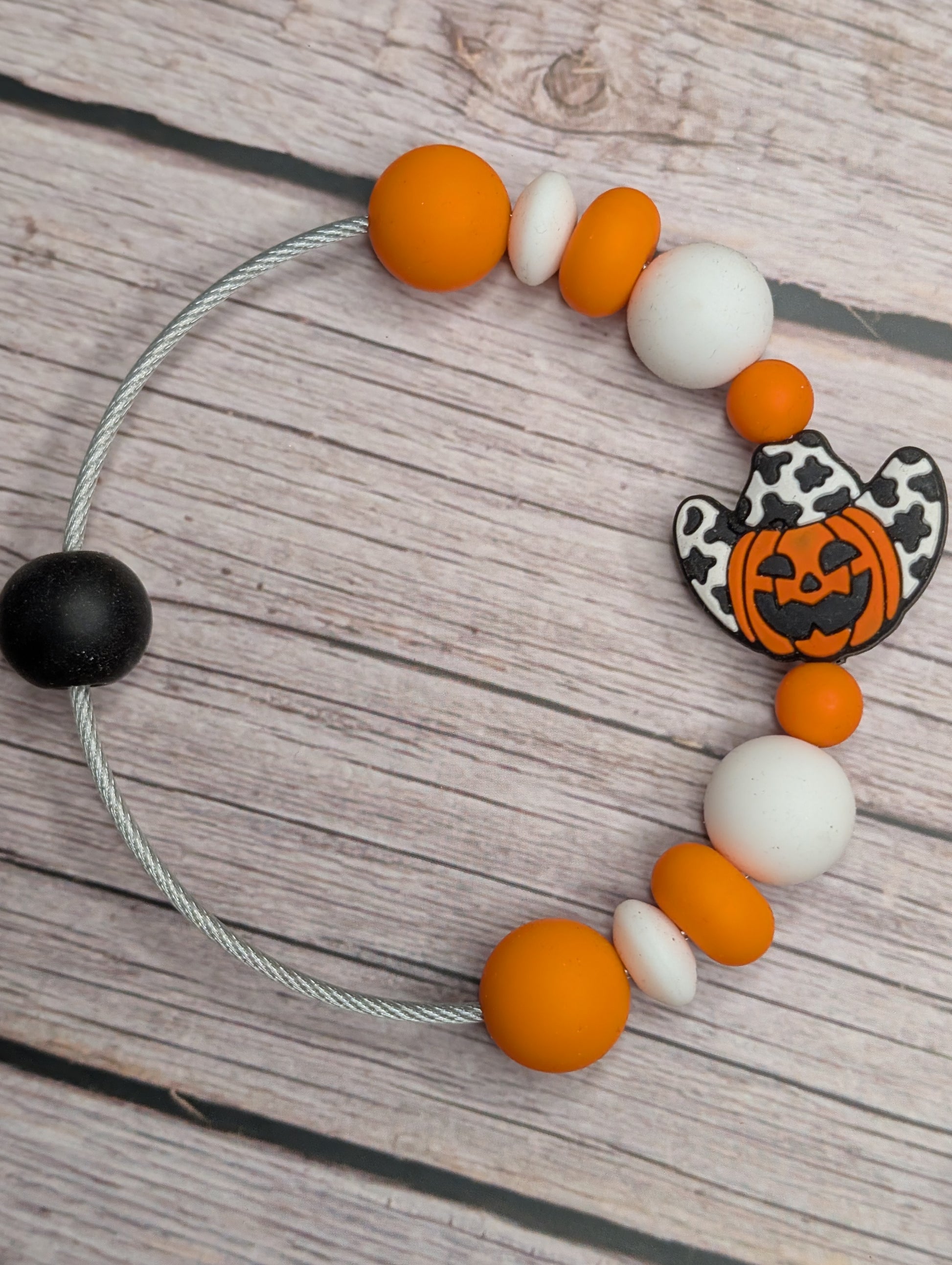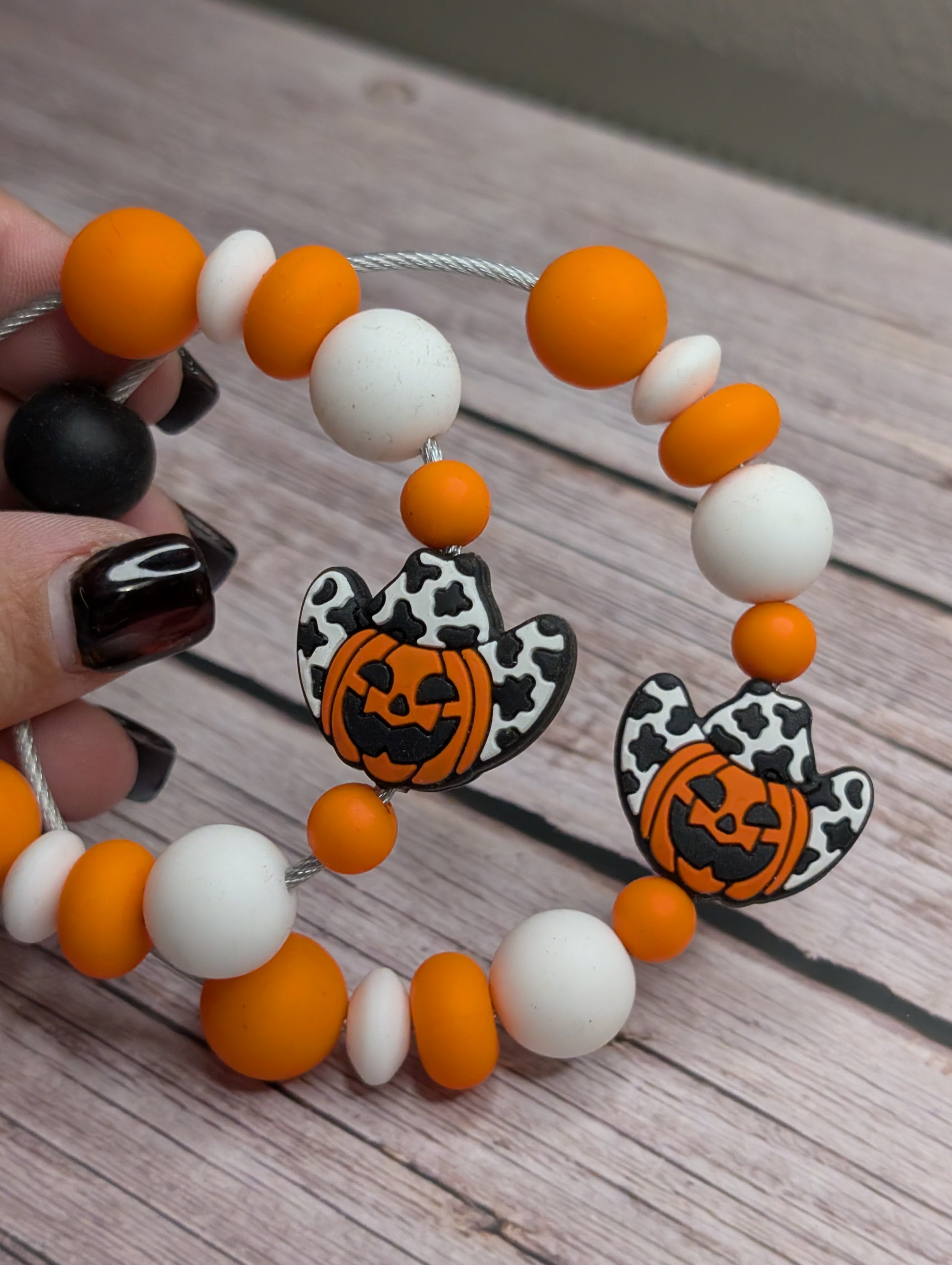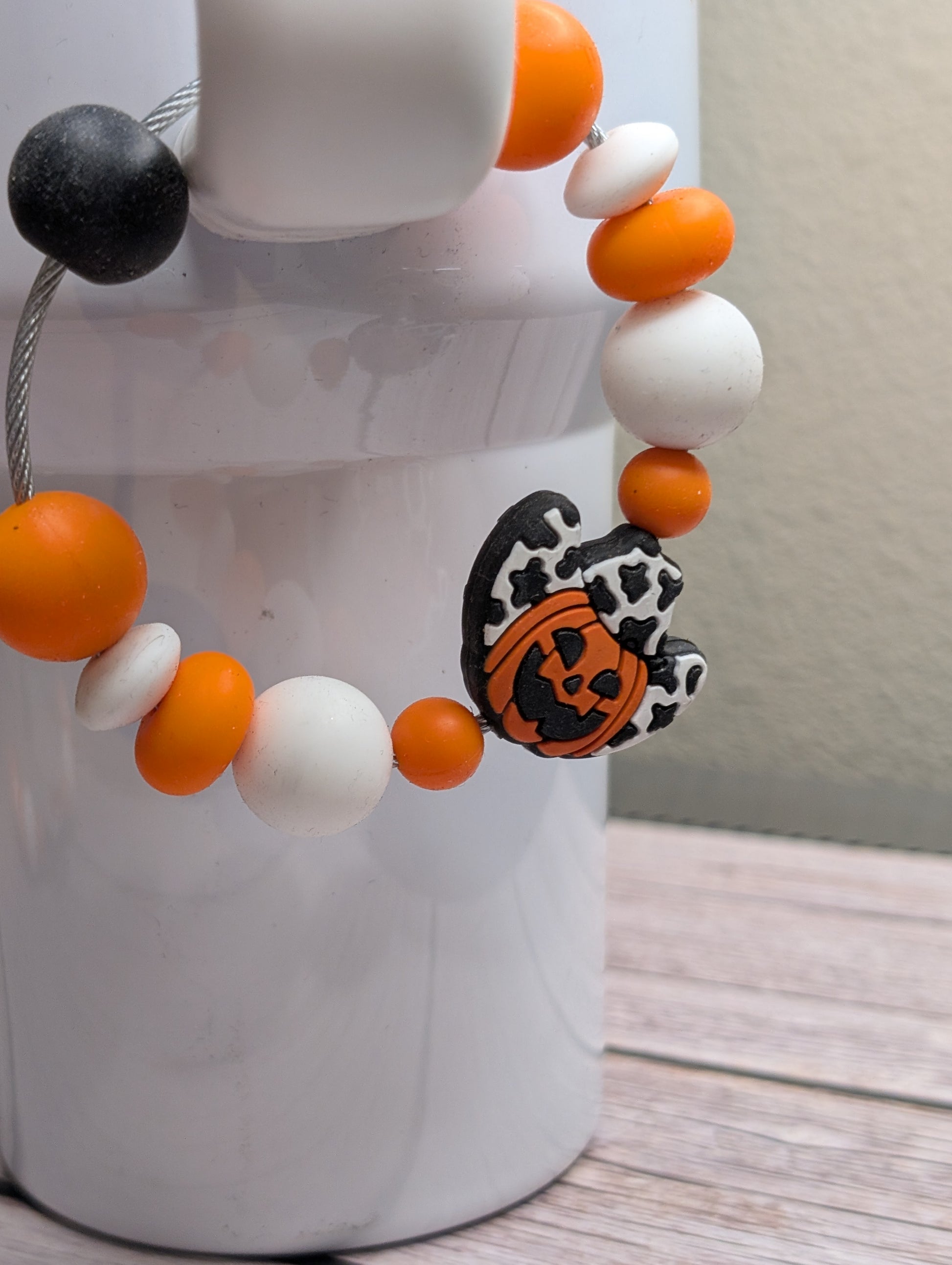 This charm showcases food-grade silicone beads and depicts a pumpkin adorned with a cowboy hat. Made for handles on drink cups. It is available in two different sizes.