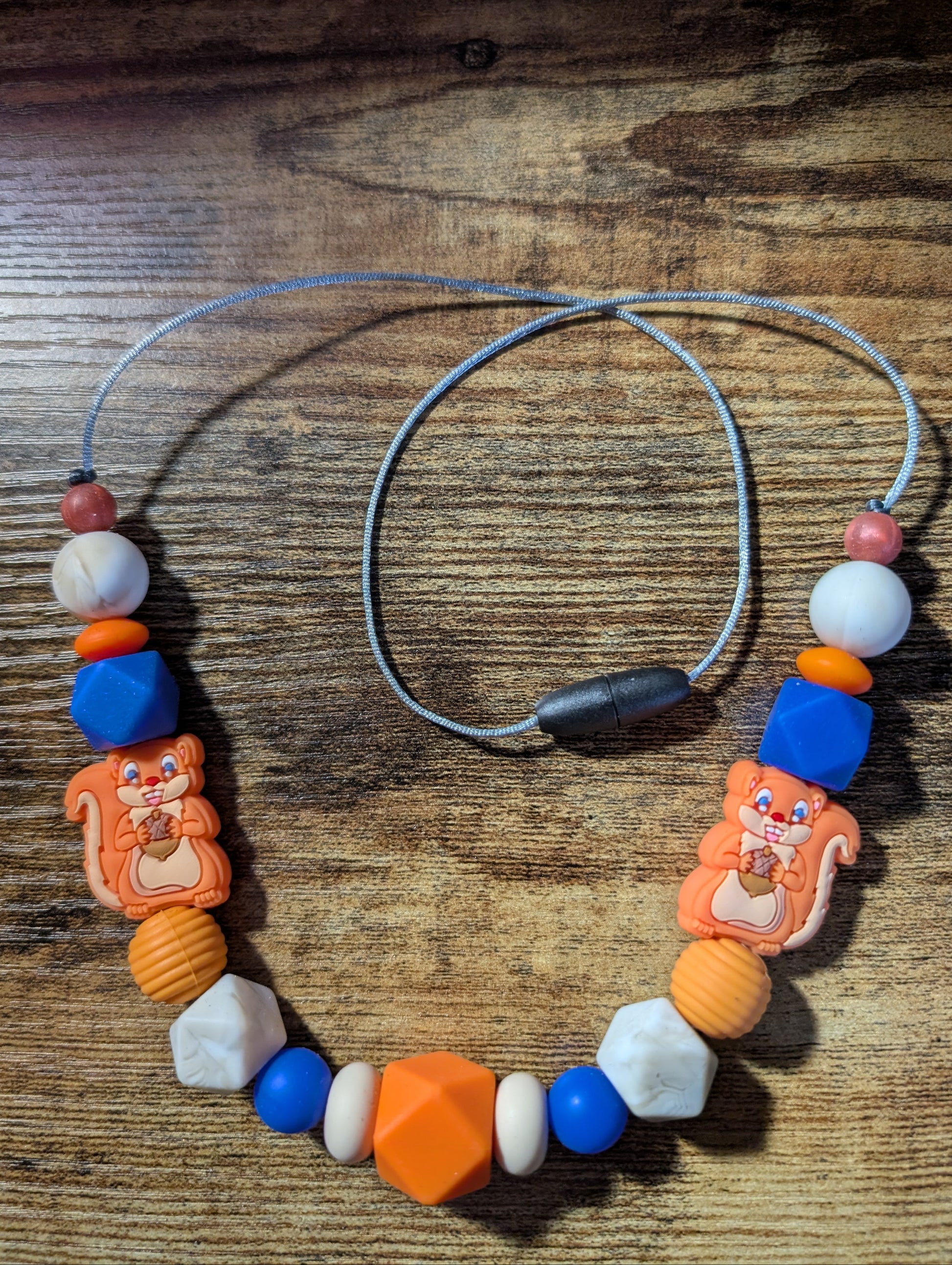 This sensory necklace features premium food-grade silicone beads strung on a delicate silver silk cord, finished with a secure black breakaway clasp. Designed for tactile stimulation and comfort, it combines safe materials with refined aesthetics for everyday wear.