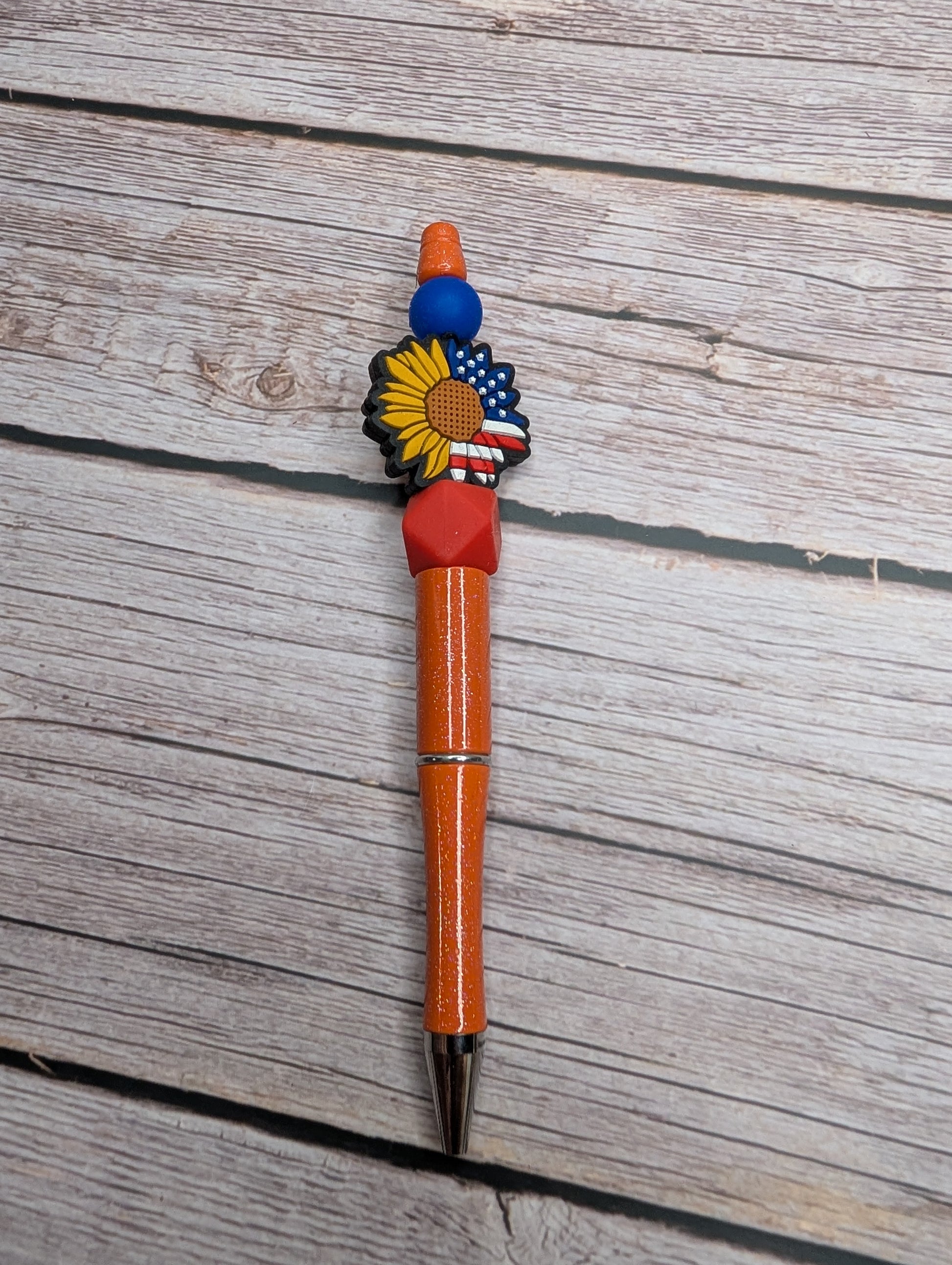 This 5.5-inch beaded pen is crafted from food-grade silicone beads and features a sparkling orange body. It uses black ink and includes tactile fidget components, highlighted by blue and red beads and a unique focal bead combining a sunflower and a flag design.
