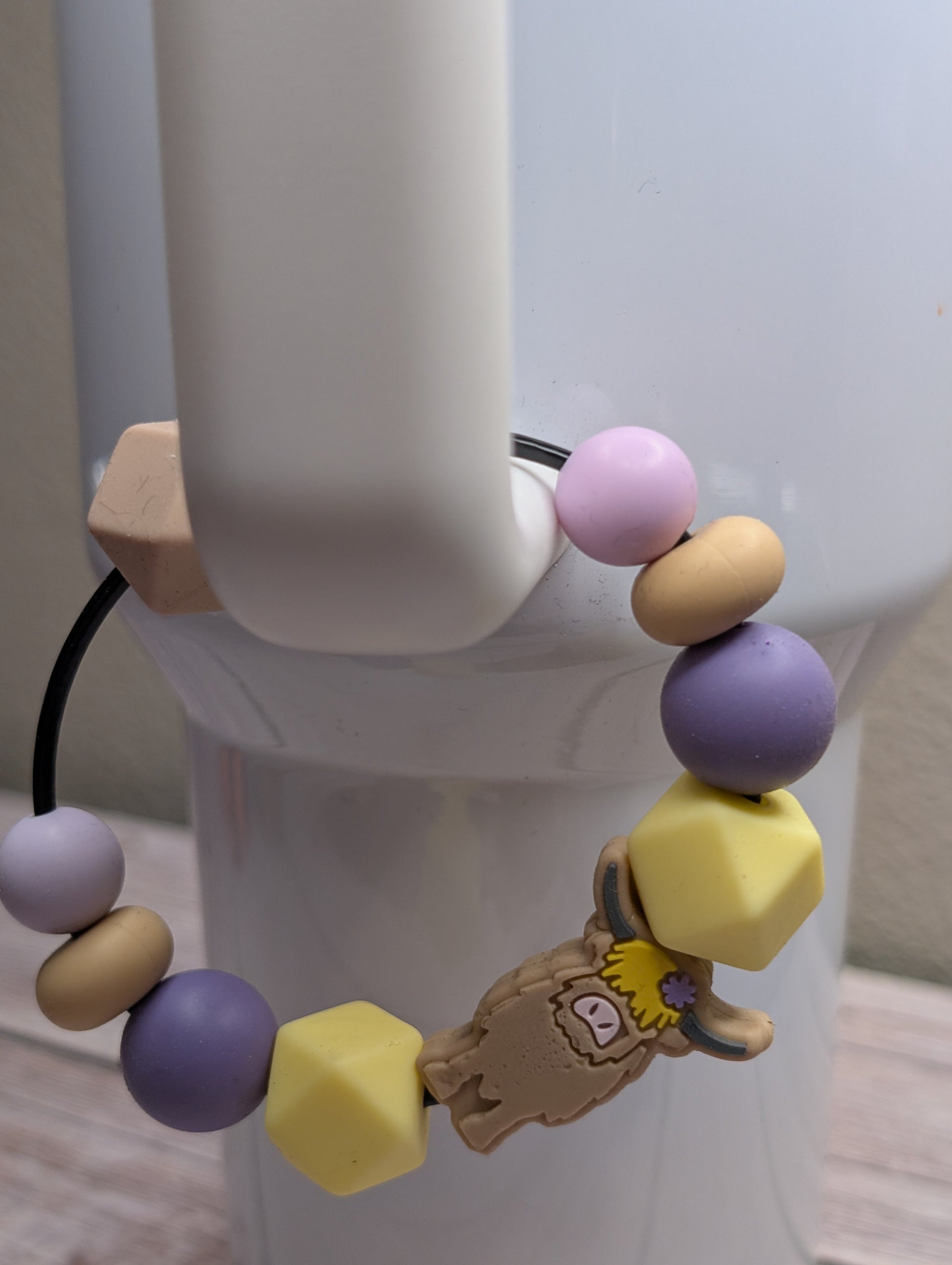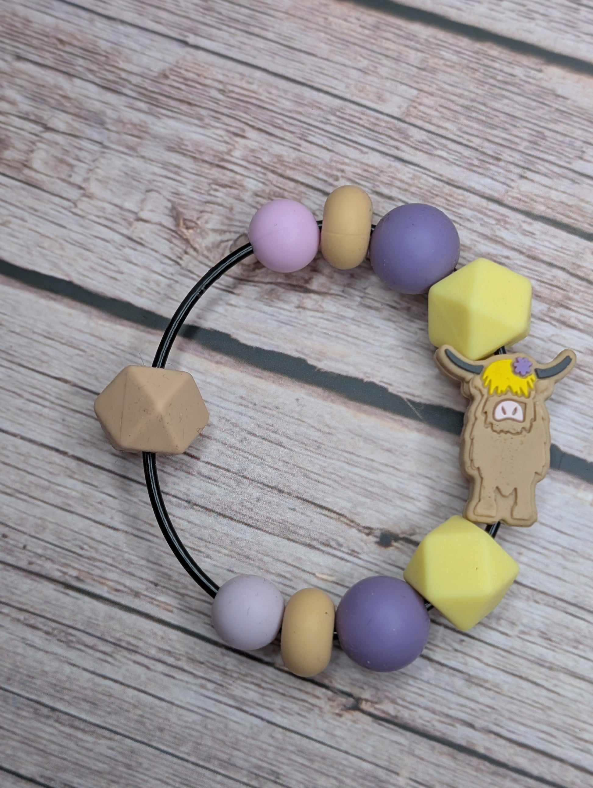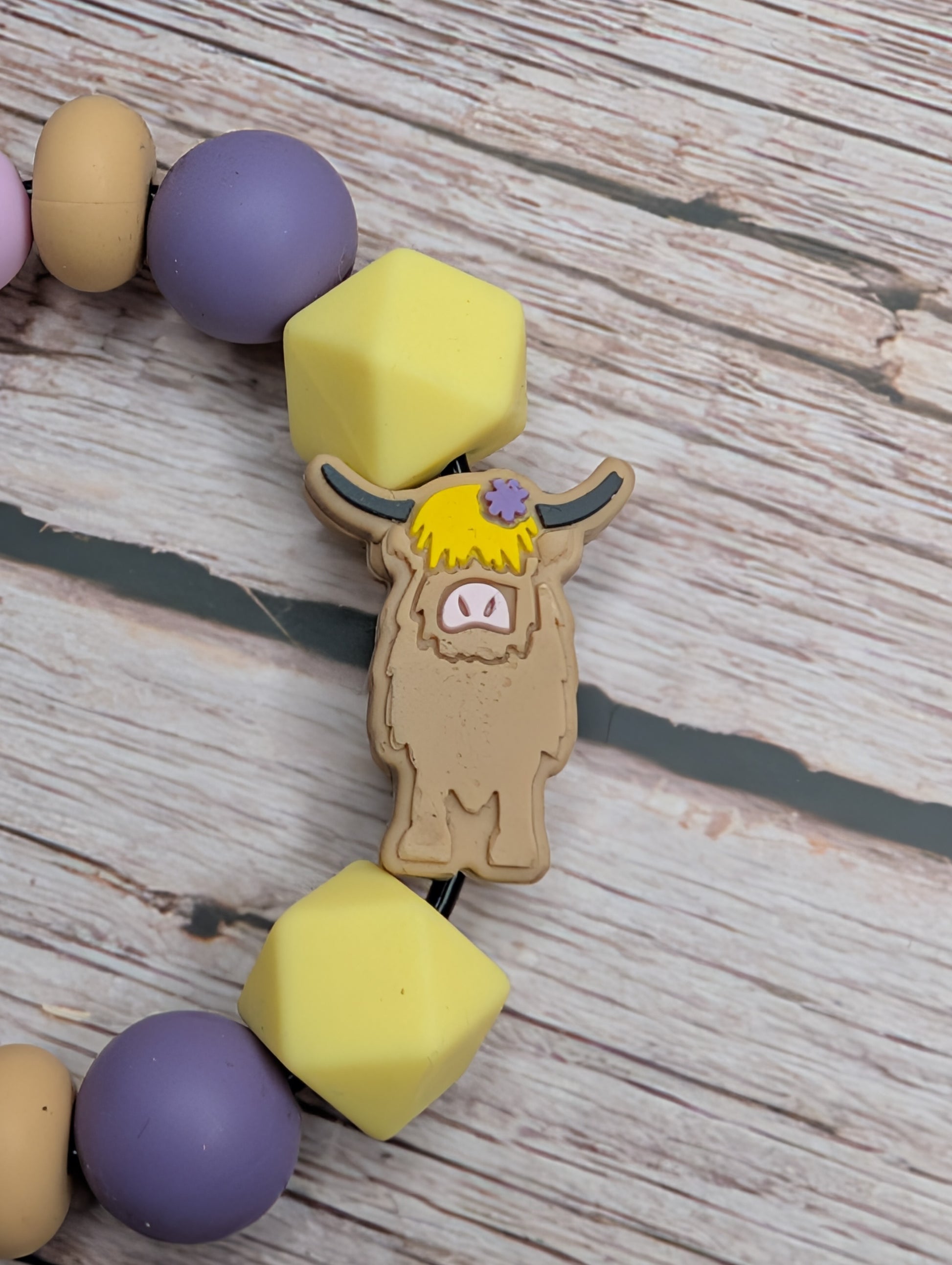 This charm is crafted from food-grade silicone beads and showcases a Highland cow adorned with a lavender flower. It measures approximately 3 inches in diameter.